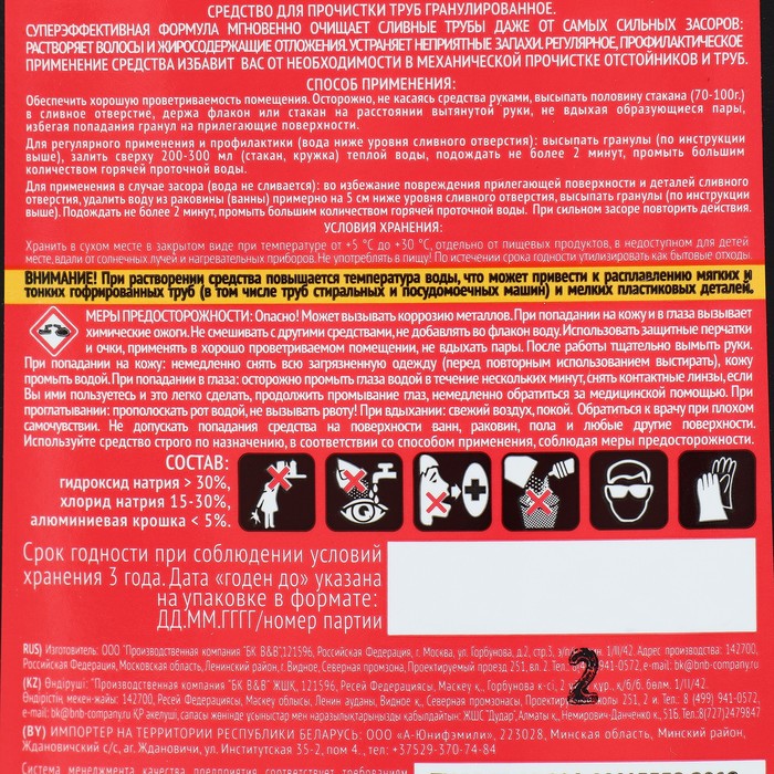 Благодаря суперэффективной формуле гранулированное средство мгновенно очищает сливные трубы даже от самых сильных засоров.