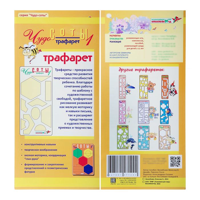 Трафарет «Чудо-соты 1» является приложением к одноимённой игре. Обучающее пособие для пространственного конструирования сделано из прозрачного пластика. С помощью данной игры ребёнок будет обводить и рисовать на бумаге геометрические фигуры и составлять разнообразные картинки и чертежи. Элементы на поле специально вырезаны под детали настольной игры «Чудо-соты 1». Инструкция в наборе содержит 7 примеров-заданий для работы.