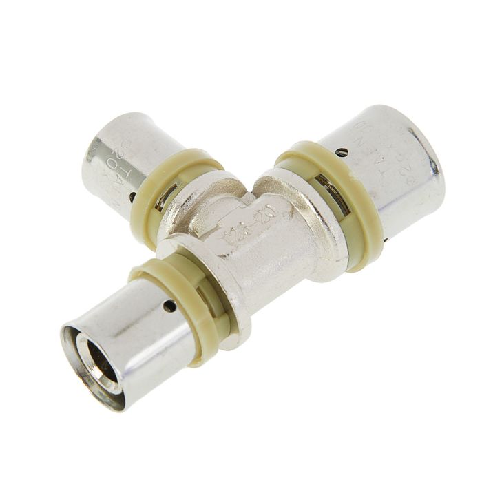 Тройник предназначен для подключения запорной арматуры, а также для скрепления сразу нескольких металлопластиковых труб различного диаметра в единую систему водоснабжения. Герметичность монтажа обеспечивается деформацией стальной втулки, которая происходит при сдавливании фитинга пресс-клещами.