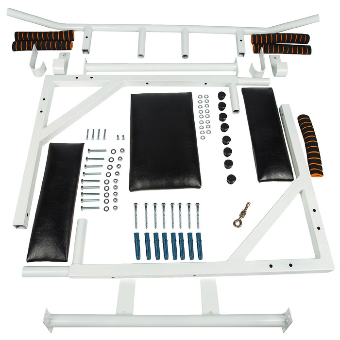 Благодаря такому гимнастическому снаряду домашние упражнения станут разнообразнее и эффективнее. Простая конструкция легко устанавливается с помощью восьми анкерных болтов. Данная модель объединяет тренажёр для пресса, турник и брусья (необходимо перевернуть предмет). Мягкие подлокотники и спинка не создают дискомфорта при эксплуатации. На специальные крючки можно подвесить боксёрский мешок. Закрепите изделие на свободной стене в хорошо проветриваемом помещении и занимайтесь спортом в удобное для вас время.