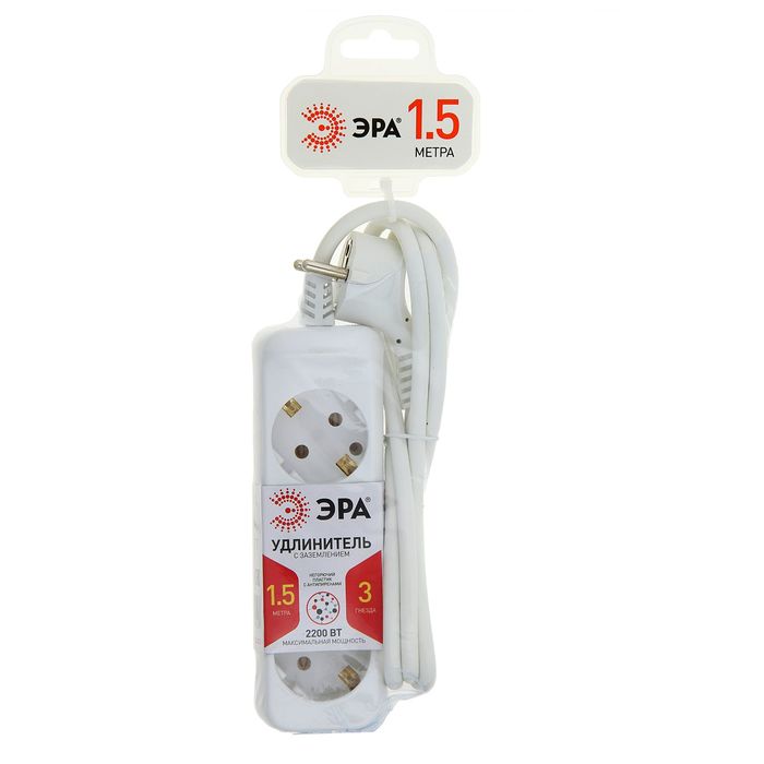 Удлинитель бытовой "ЭРА" U-3e-1.5m, 3 розетки, 1.5 м, 10 А, 2200 Вт, с з/к