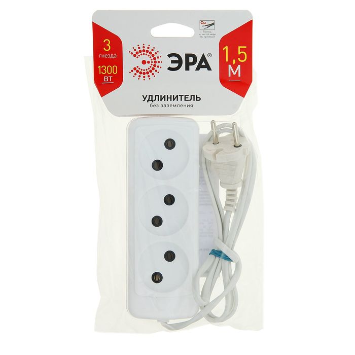Удлинитель бытовой "ЭРА" UX-3-1.5m, 3 розетки, 1.5 м, 6 А, 1300 Вт, без з/к