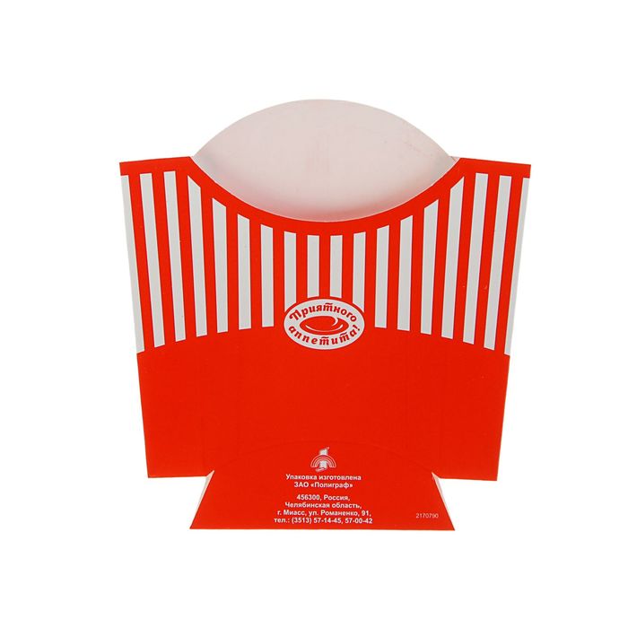 Обеспечить длительный срок хранения продуктов вам поможет Упаковка для картофеля фри 150 гр, с печатью. Эргономичное изделие используется в качестве одноразовой посуды.