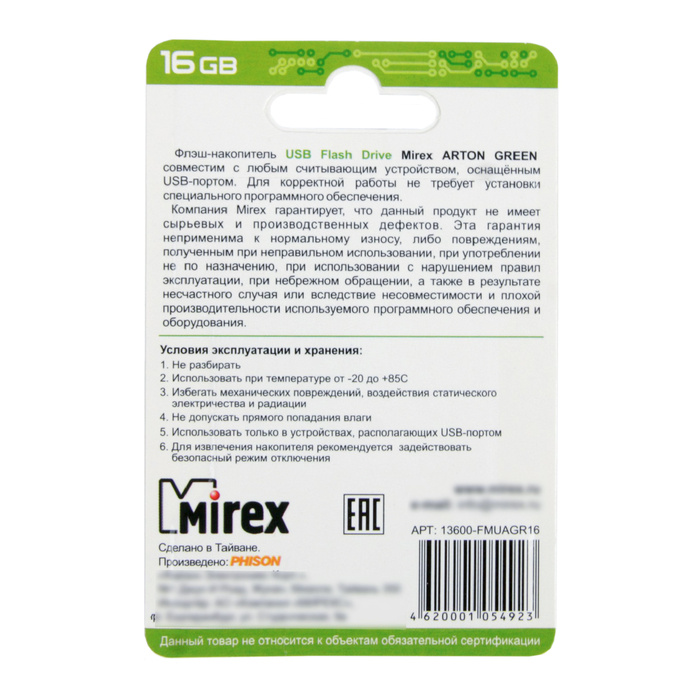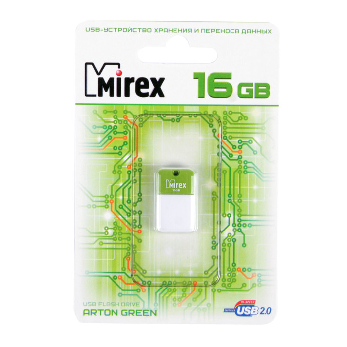 USB-флешка 16 Gb Mirex ARTON GREEN, зеленая подойдёт для тех, кому необходимо иметь съёмный носитель для хранения и перемещения данных различных форматов.