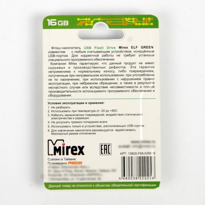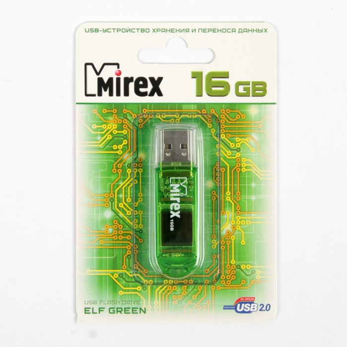 USB-флешка 16 Gb Mirex ELF GREEN, зеленая подойдёт для тех, кому необходимо иметь съёмный носитель для хранения и перемещения данных различных форматов.