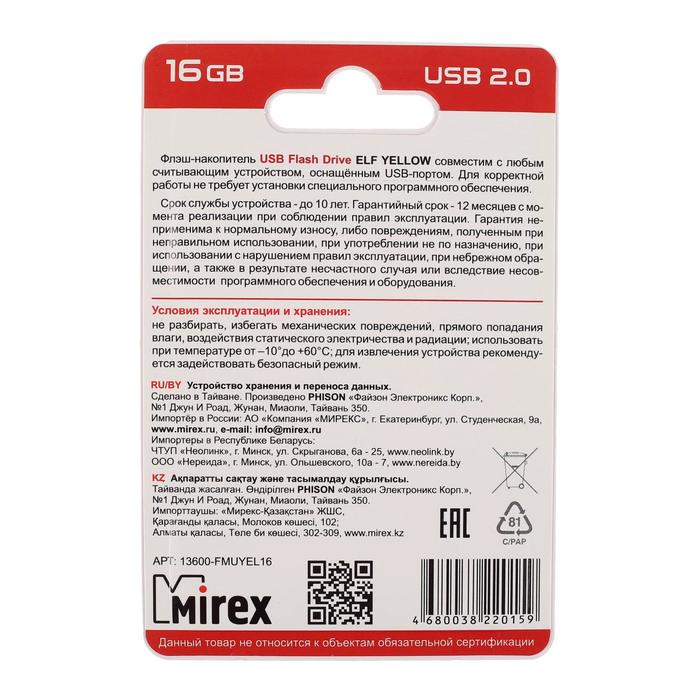 USB-флешка 16 Gb Mirex ELF YELLOW, желтая подойдёт для тех, кому необходимо иметь съёмный носитель для хранения и перемещения данных различных форматов.