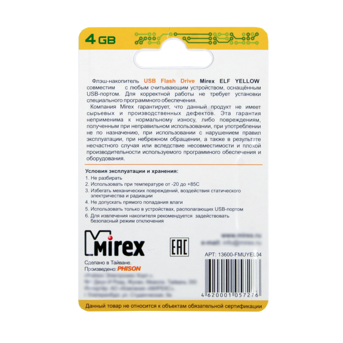 USB-флешка 4 Gb Mirex ELF YELLOW, желтая подойдёт для тех, кому необходимо иметь съёмный носитель для хранения и перемещения данных различных форматов.