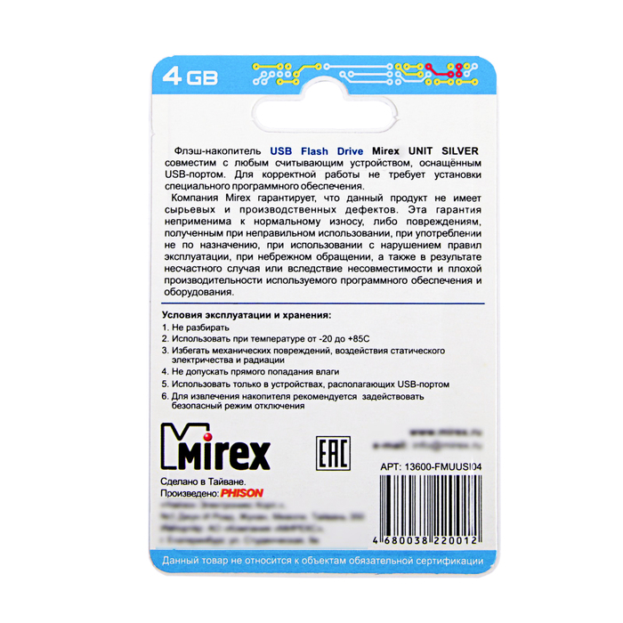 USB-флешка 4 Gb Mirex UNIT SILVER, серебряная подойдёт для тех, кому необходимо иметь съёмный носитель для хранения и перемещения данных различных форматов.