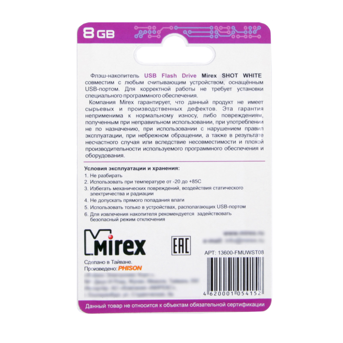 USB-флешка 8 Gb Mirex SHOT WHITE, белая подойдёт для тех, кому необходимо иметь съёмный носитель для хранения и перемещения данных различных форматов.