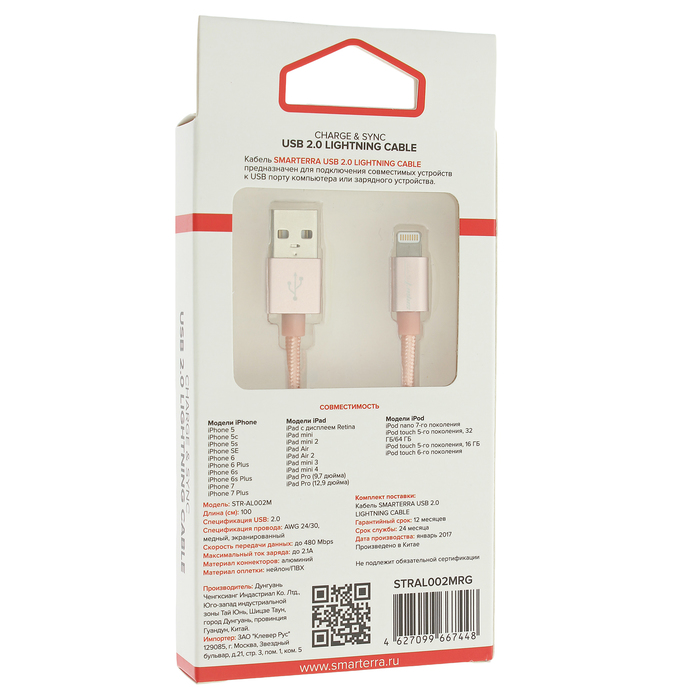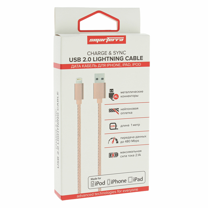 Кабель Smarterra STR-AL002M позволит заряжать гаджет с разъёмом Lightning и передавать данные между ним и компьютером. Таким интерфейсом оснащены смартфоны, планшеты и плееры компании Apple, которые выпускаются с 2012 года. Нейлоновая оплётка защитит шнур от затирания и перегибов.