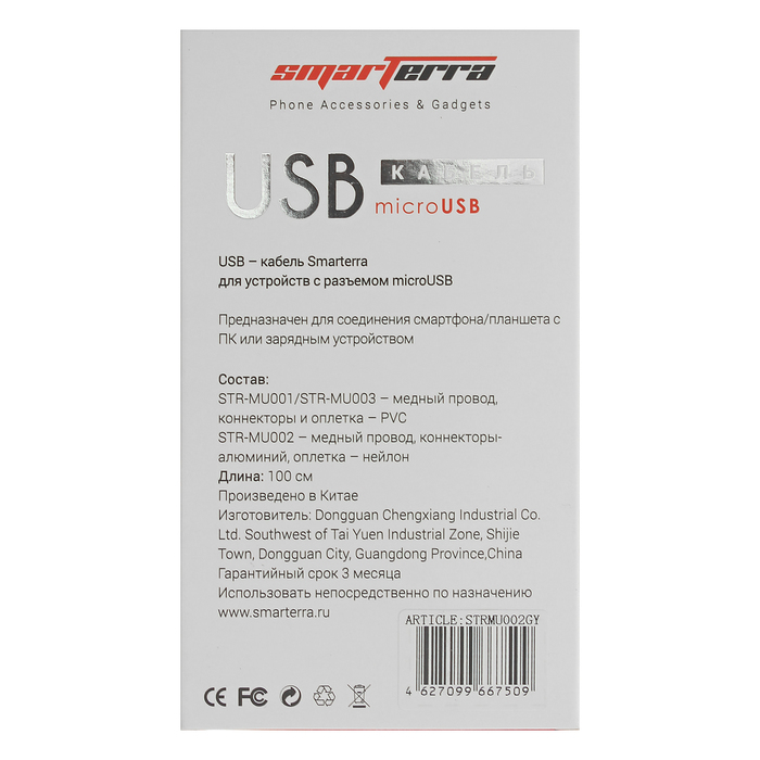 Кабель Smarterra STR-MU002 позволит заряжать гаджет с разъёмом micro-USB и передавать данные между ним и компьютером. Нейлоновая оплётка защитит шнур от затирания и перегибов.