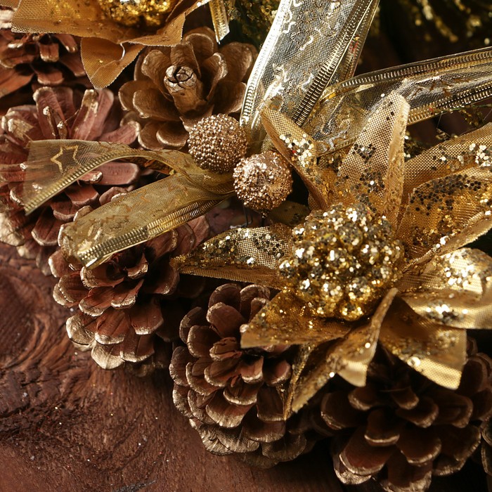 Венок новогодний d-29 см "Шишки" золотые цветы и ленты