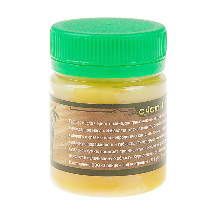 Восточный бальзам "Al Jayid" от боли в суставах, 40 мл сочетает в себе лечебные и косметические ингредиенты, которые благоприятно воздействуют на кожу. Средство содержит минимальную дозу консервантов и совсем не имеет искусственных ароматизаторов, парфюмерных отдушек и прочих примесей. Это означает, что оно на 90 % состоит из натуральных компонентов.
