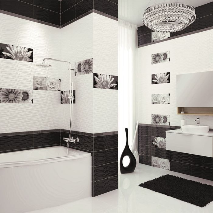 Основные цвета коллекции Wave — розовый, белый, чёрный, синий. Эти оттенки превосходно гармонируют между собой и отлично сочетаются с другими предметами интерьера. Коллекция состоит из облицовочной плитки, вставки, бордюра и панно. Соберите все декоративные элементы данной серии для создания уютной атмосферы.
