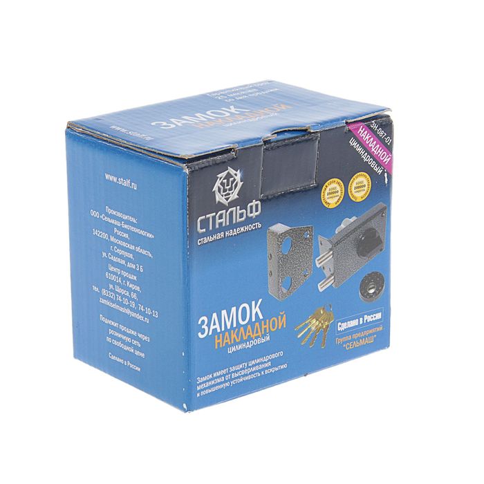 Накладной цилиндровый замок крепится к двери с помощью 8 саморезов. Механизм имеет защиту от высверливания.