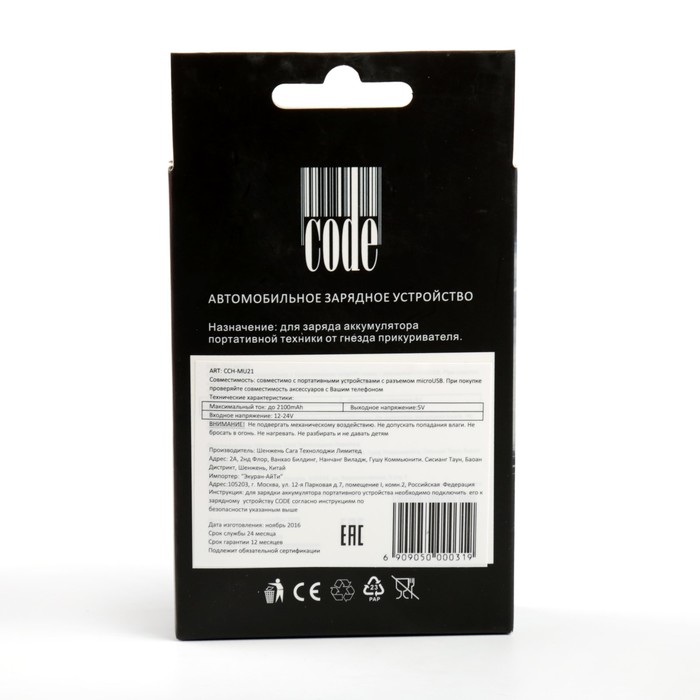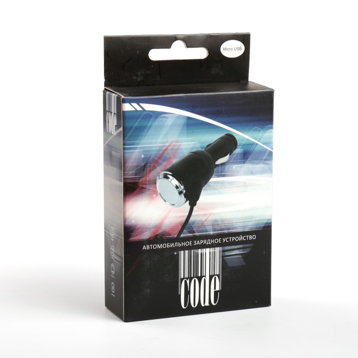Зарядное устройство автомобильное CODE, разъем microUSB, 2.1A, кабель 1 метр, черное