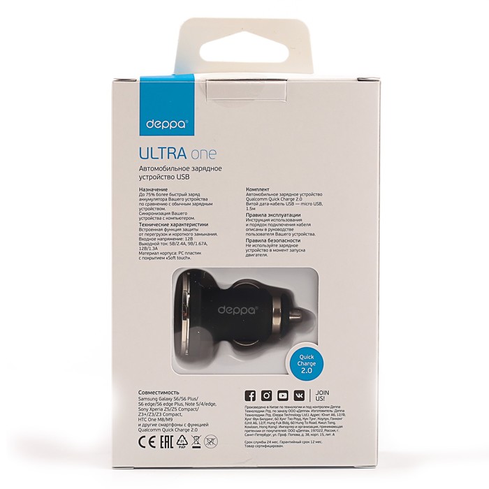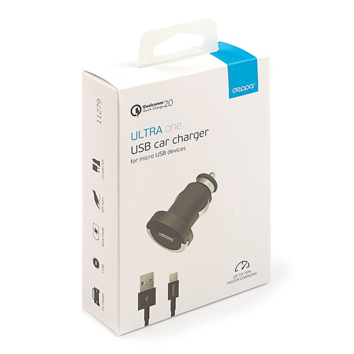 Зарядное устройство автомобильное Deppa Qualcomm Quick Charge 2.0+кабель micro USB, черное
