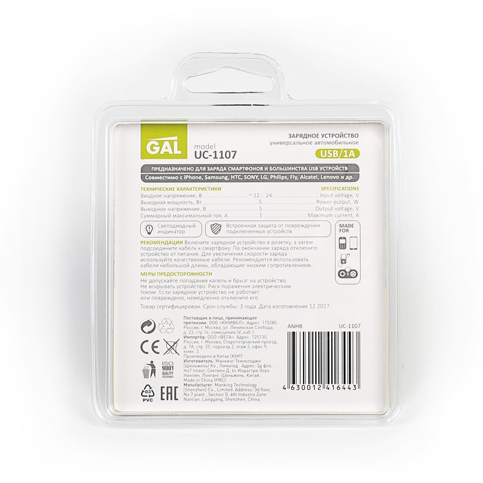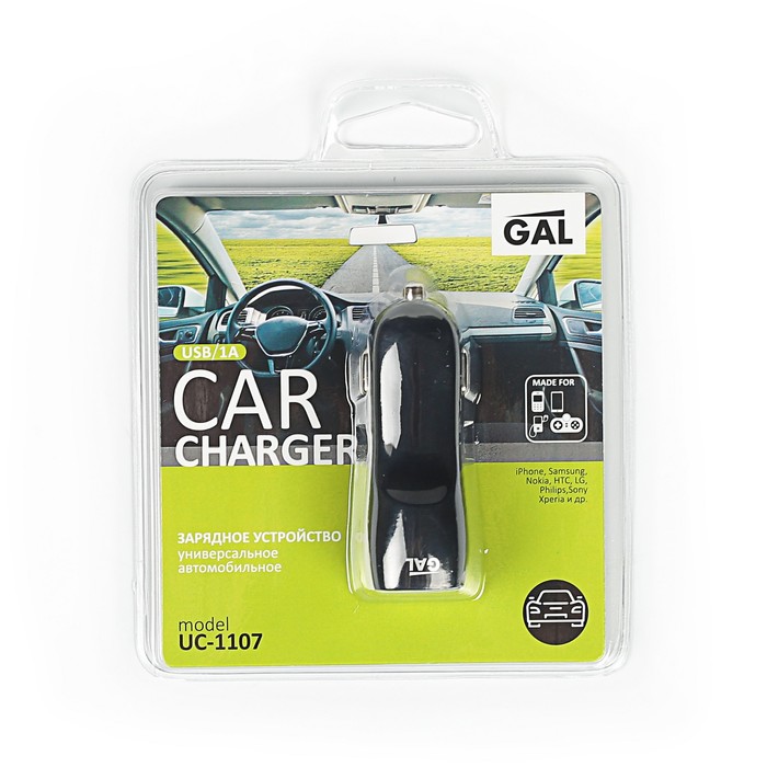 Зарядное устройство автомобильное GAL UC-1107, 1 А, USB, черное