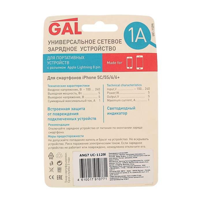 Зарядное устройство GAL UC-1129i, Lightning, 1 А, белое