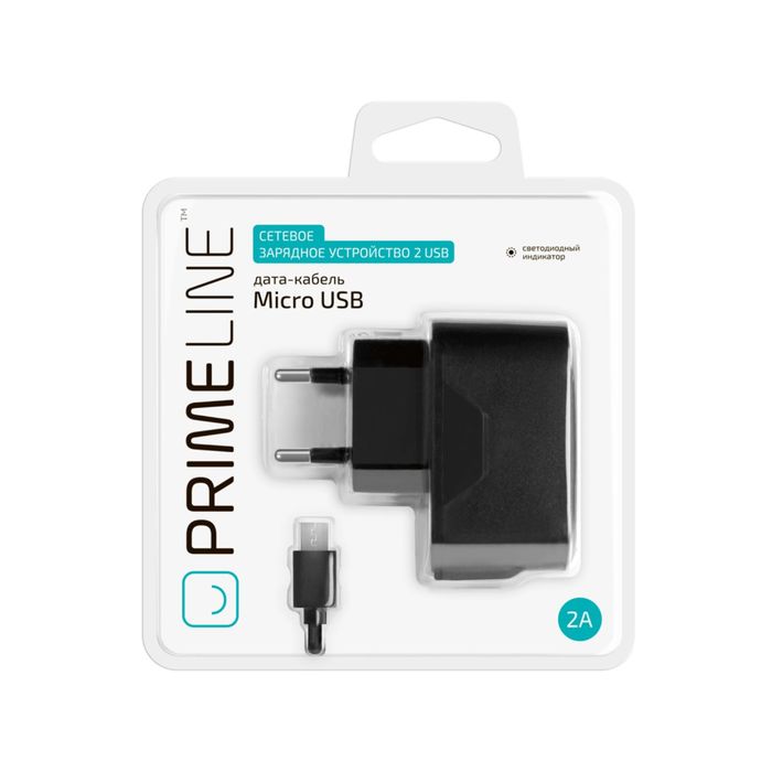 Зарядное устройство Prime Line (2314) 2 USB + кабель micro USB 2100 mA, черное