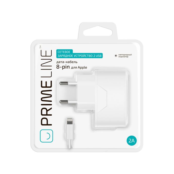 Зарядное устройство Prime Line (2316) 2 USB + кабель 8-pin 2100 mA, белое
