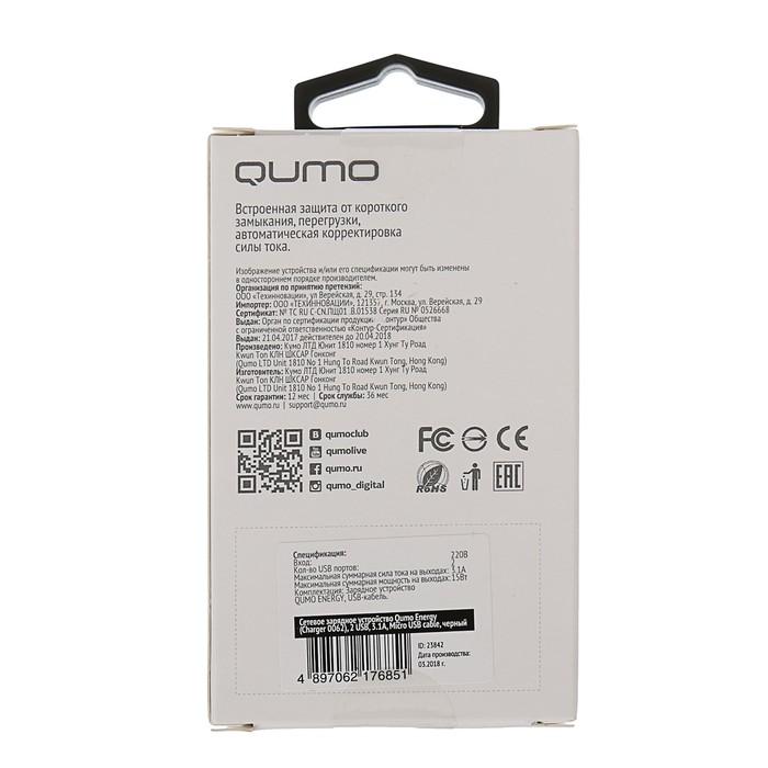 Зарядное устройство Qumo Energy, 2 USB, 3.1А, micro USB кабель