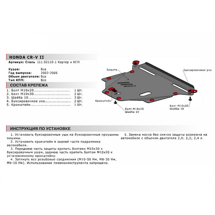 Не секрет, что машина давно уже перестала восприниматься как просто средство передвижения, и водители покупают всё лучшее для своих железных коней. Защита картера и КПП АвтоБРОНЯ для Honda CR-V 2002-2006, крепеж в комплекте, сталь, 2 мм, 111.02110.1 — идеальный выбор, если вы ставите целью и улучшение технических характеристик, и поддержание внешнего вида автомобиля.