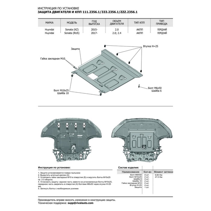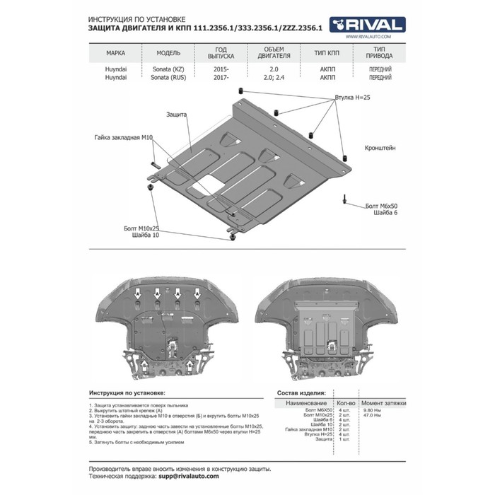 Не секрет, что машина давно уже перестала восприниматься как просто средство передвижения, и водители покупают всё лучшее для своих железных коней. Защита картера и КПП Rival для Hyundai Sonata (Казахстан) 2015-н.в., 111.2356.1 — идеальный выбор, если вы ставите целью и улучшение технических характеристик, и поддержание внешнего вида автомобиля.