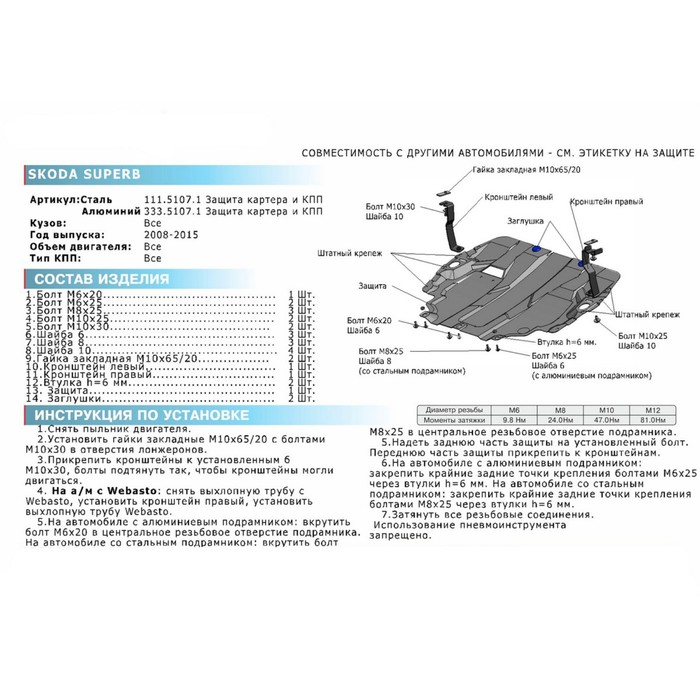 Защита картера и КПП Rival Skoda Superb 2008-2015, 111.5107.1
