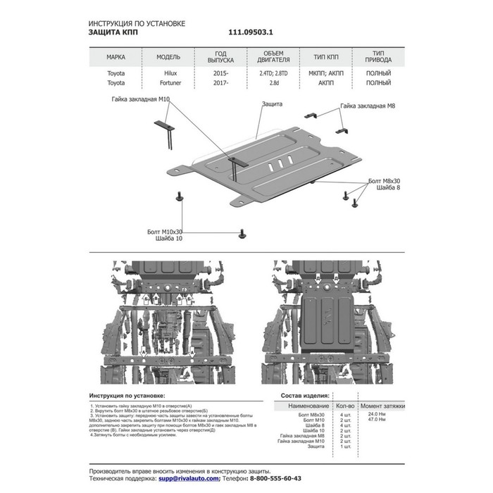 Защита КПП Toyota Hilux 4WD 2015-, сталь 2 мм, комплект крепежа, 111.09503.1
