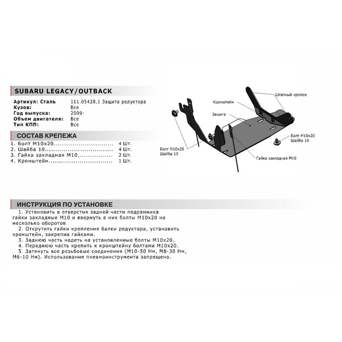 Защита редуктора АвтоБРОНЯ для Subaru Legacy 2010-2015, крепеж в комплекте, сталь, 2 мм, 111.05428.1