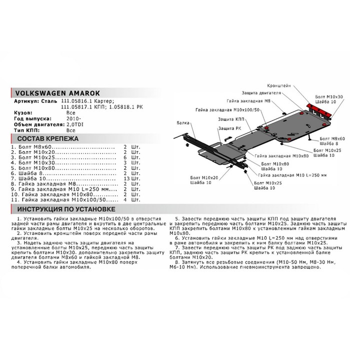 Защита РК АвтоБРОНЯ для Volkswagen Amarok (V - 2.0d) 2010-2016, крепеж в комплекте, сталь, 2 мм, 111.05818.1