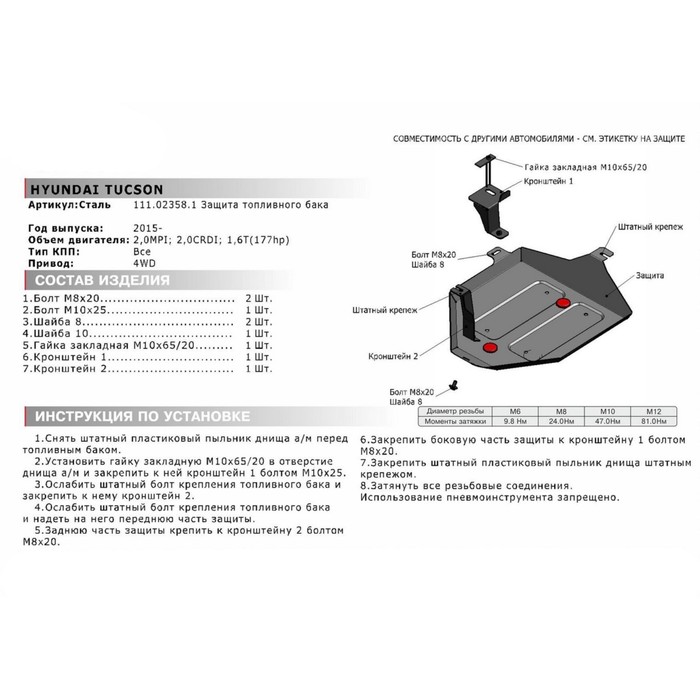 Не секрет, что машина давно уже перестала восприниматься как просто средство передвижения, и водители покупают всё лучшее для своих железных коней. Защита топливного бака АвтоБРОНЯ для Hyundai Tucson (V - 1.6T177л.с; 2.0; 2.0d) 2015-н.в., крепеж в комплекте, сталь, 2 мм, 111.02358.1 — идеальный выбор, если вы ставите целью и улучшение технических характеристик, и поддержание внешнего вида автомобиля.