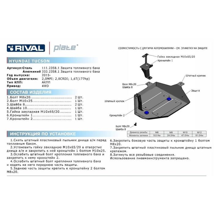 Не секрет, что машина давно уже перестала восприниматься как просто средство передвижения, и водители покупают всё лучшее для своих железных коней. Защита топливного бака Rival для Hyundai Tucson (V - 1.6T 177л.с; 2.0; 2.0d) 2015-, крепеж в комплекте, алюминий 4 мм — идеальный выбор, если вы ставите целью и улучшение технических характеристик, и поддержание внешнего вида автомобиля.