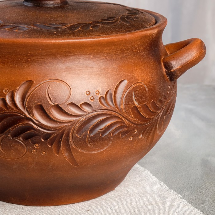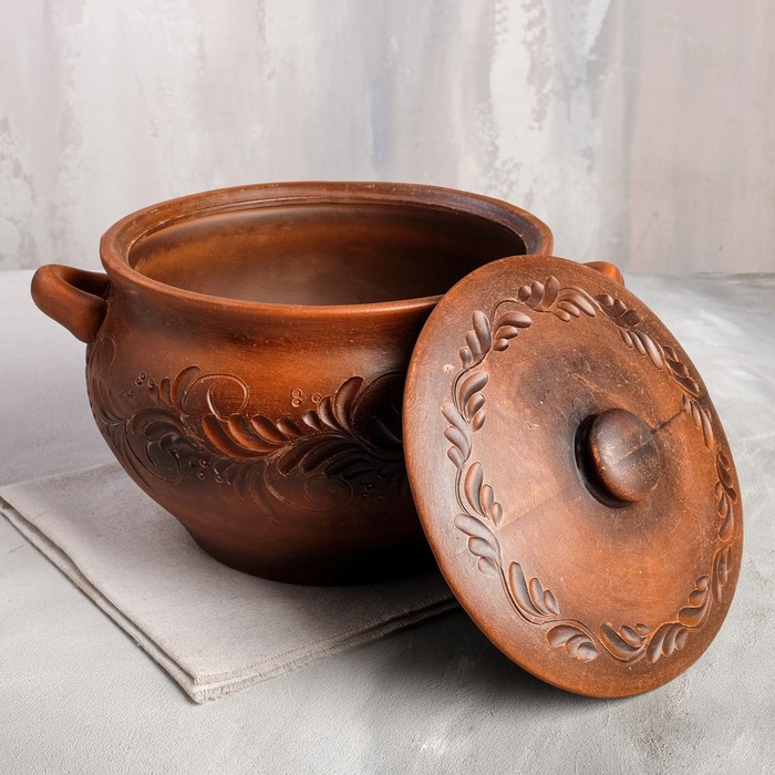 Жаровня — это посуда для приготовления пищи в духовке. Подходит для тушения или длительного томления овощей, мяса, дичи. Она сделана из красной глины и имеет продуманную форму, что обеспечивает теплообмен между жаровней и блюдом, а также помогает сохранить полезные свойства продуктов.